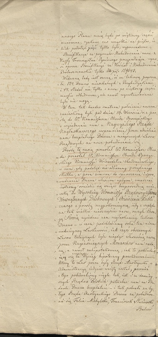 Pomimo jednak służącego nam prawa do części lasów miejscowych, pokładamy jak największą ufność w nieograniczoną łaskawość najwyższego Rządu, że przez samą okazywaną ciągle nad nieszczęśliwymi ojcowską litość raczy i nas i miasta swego pogorzelców wesprzeć najdobrotliwszą opieką swą swoją i miłosierdziem, pomimo przypadającej nam z kasy Towarzystwa Ogniowego bonifikacji nigdy nie bylibyśmy w stanie pobudować się wedle planu nowego ile zabudowania nasze podwyższającego i od pogorzałych wcale inną postać nadającego.